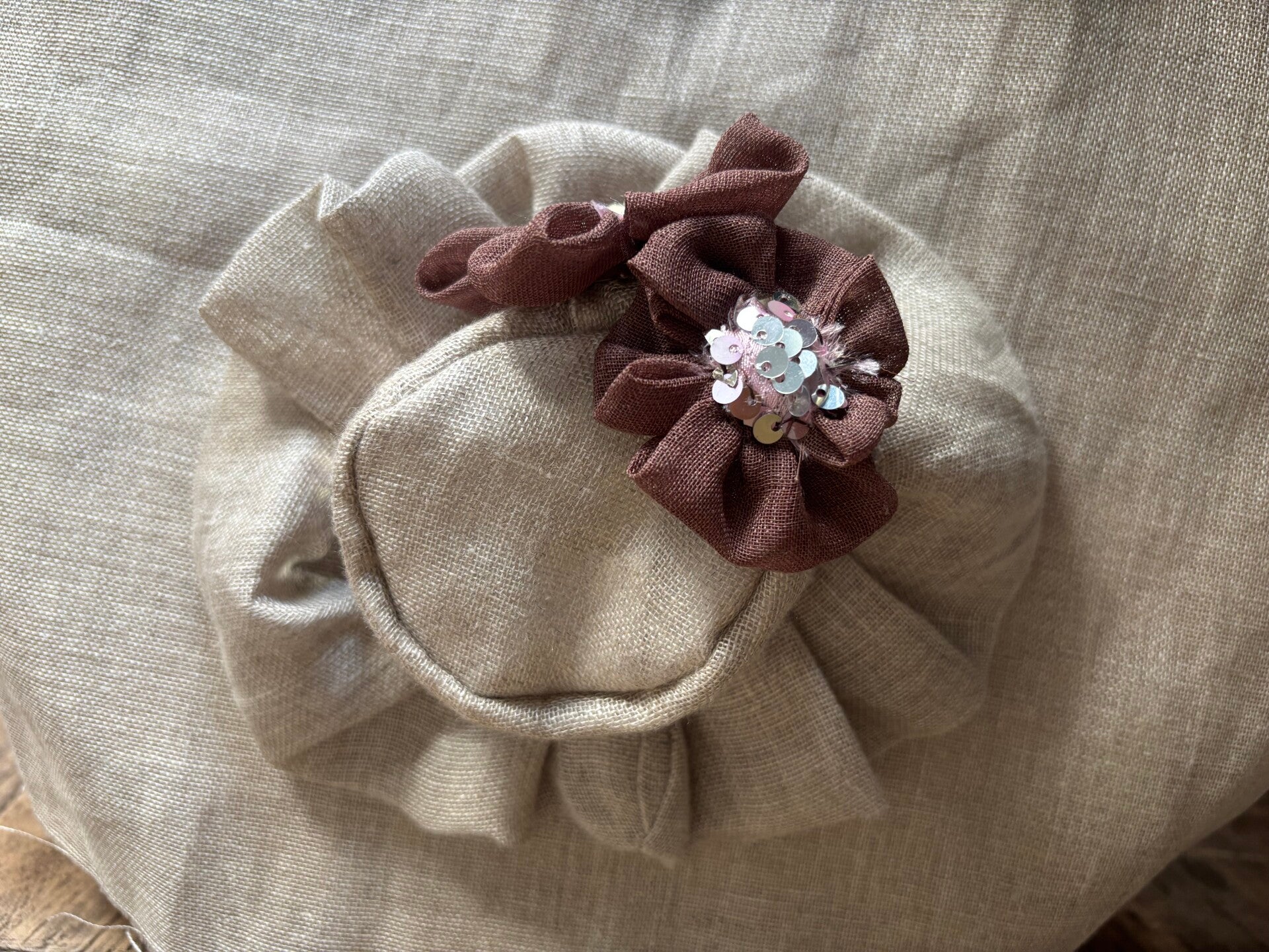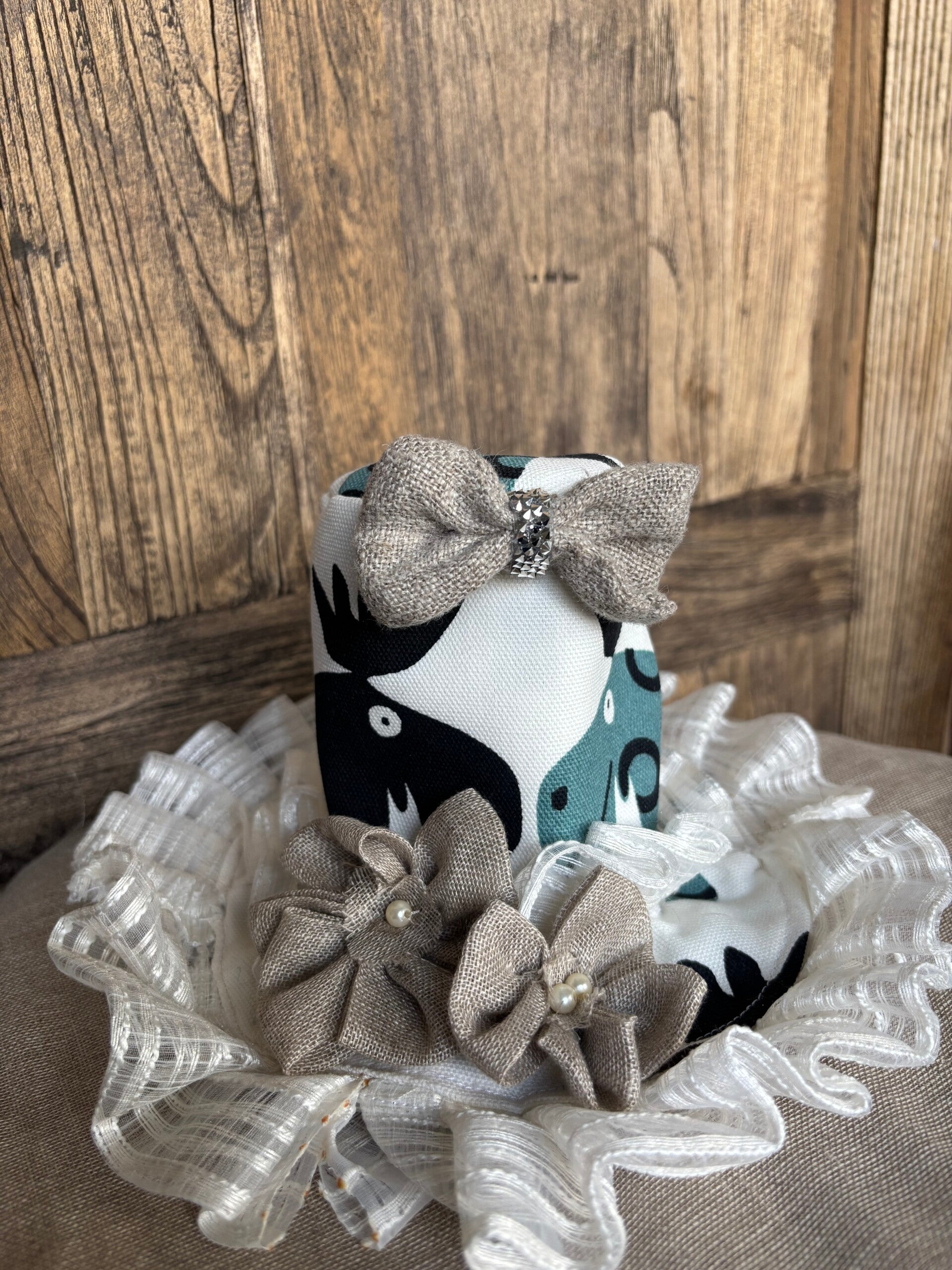 Mintun vihreässä loimessa on upeat sammaleen vihreät kohokuviot, yhdessä hennon kimaltelevien harmaiden kuvioiden kanssa, mintun vihreällä, silkki pohjalla. Loimessa on kauniit pellava rusetit, joiden keskus kimaltelee kauniisti hopealla, timanttisella strassinauhalla.
