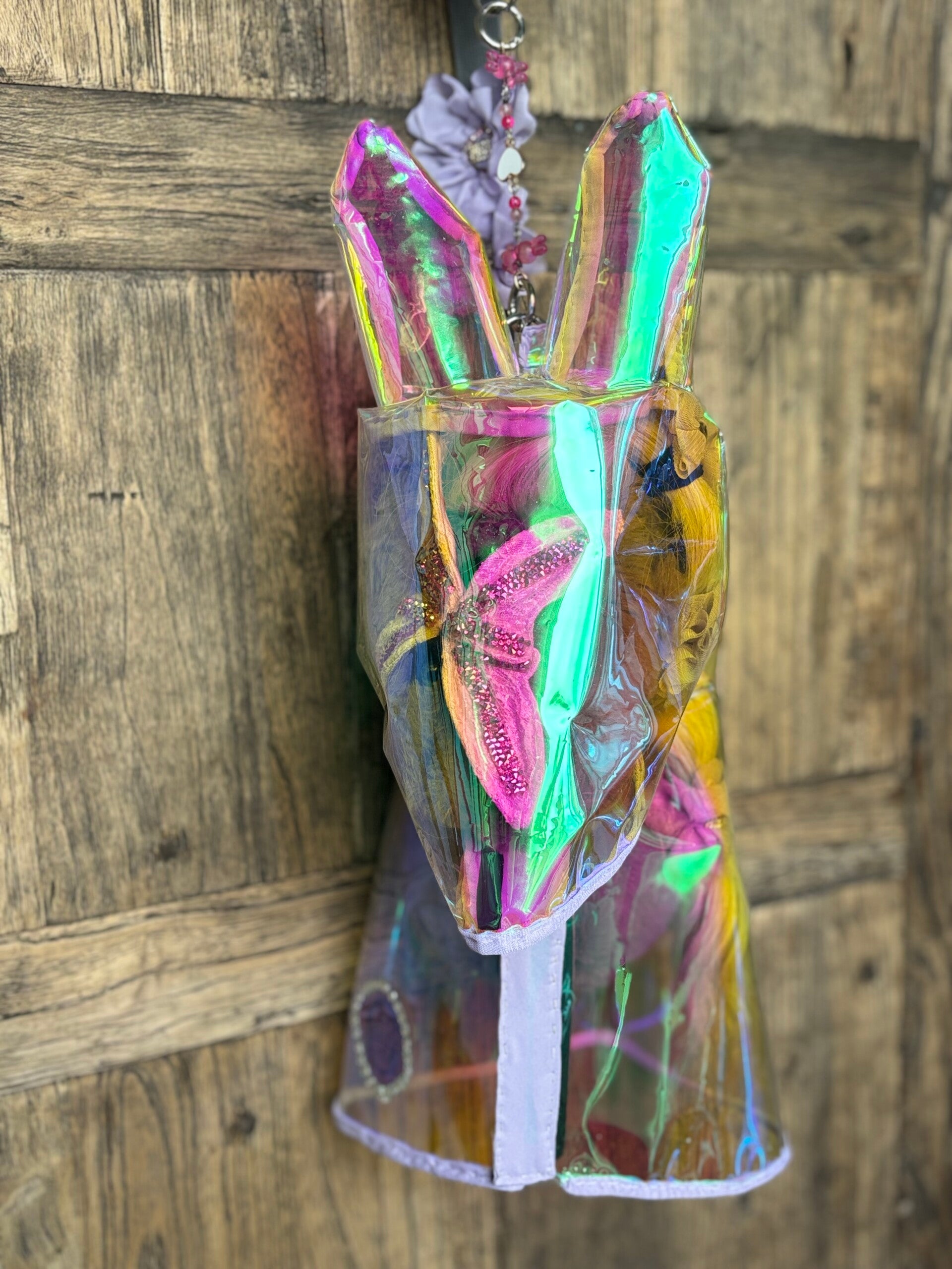 Jokaisella laukulla on myös mukanaan aivan ihastuttava anime matkakaveri. Matkakaveri vaihtelee eri laukuissa. Matkakaveri voi olla leppäkerttu, kärpänen, mittarimato, ampiainen, perhonen, tai muu pieni ötökkä. Jokaisella matkakaverilla on pienet lasisilmät ja niiden täyte on samaa vanua kuin laukkujen vanu eli silikonoitua vanua. Matkakaverit valmistetaan käsin ja ne on täysin suunniteltu ja innovoitu Suomalaisella design ajattelulla, Glamour heppojen toimesta itse. Siksi pidätämme kaikki tekijän- ja jäljentämisoikeuden itsellämme. Matkakaverit valmistetaan käsin kierrätysnahasta, tekoturkiksesta, kierrätyskankaista ja muista jäännöspaloista. Käytämme ylijäämäleikkuu kankaat matkakavereiden valmistukseen. Tällä laukulla on matkakaverinaan mahtava perhonen. Sillä on suuret valkoiset siivet, jotka on valmistettu kierrätyspitsikankaasta. Siipien päälle on liimattu hopea-pinkki sävyistä upeasti kimaltelevaa strassinauhaa. Lisäksi siivet ovat muotoiltu rautalangasta, jotta ne pitävät muotonsa. Perhosen vartalo osa on mustaa tekoturkiskangasta ja sillä on vihreät lasisilmät.