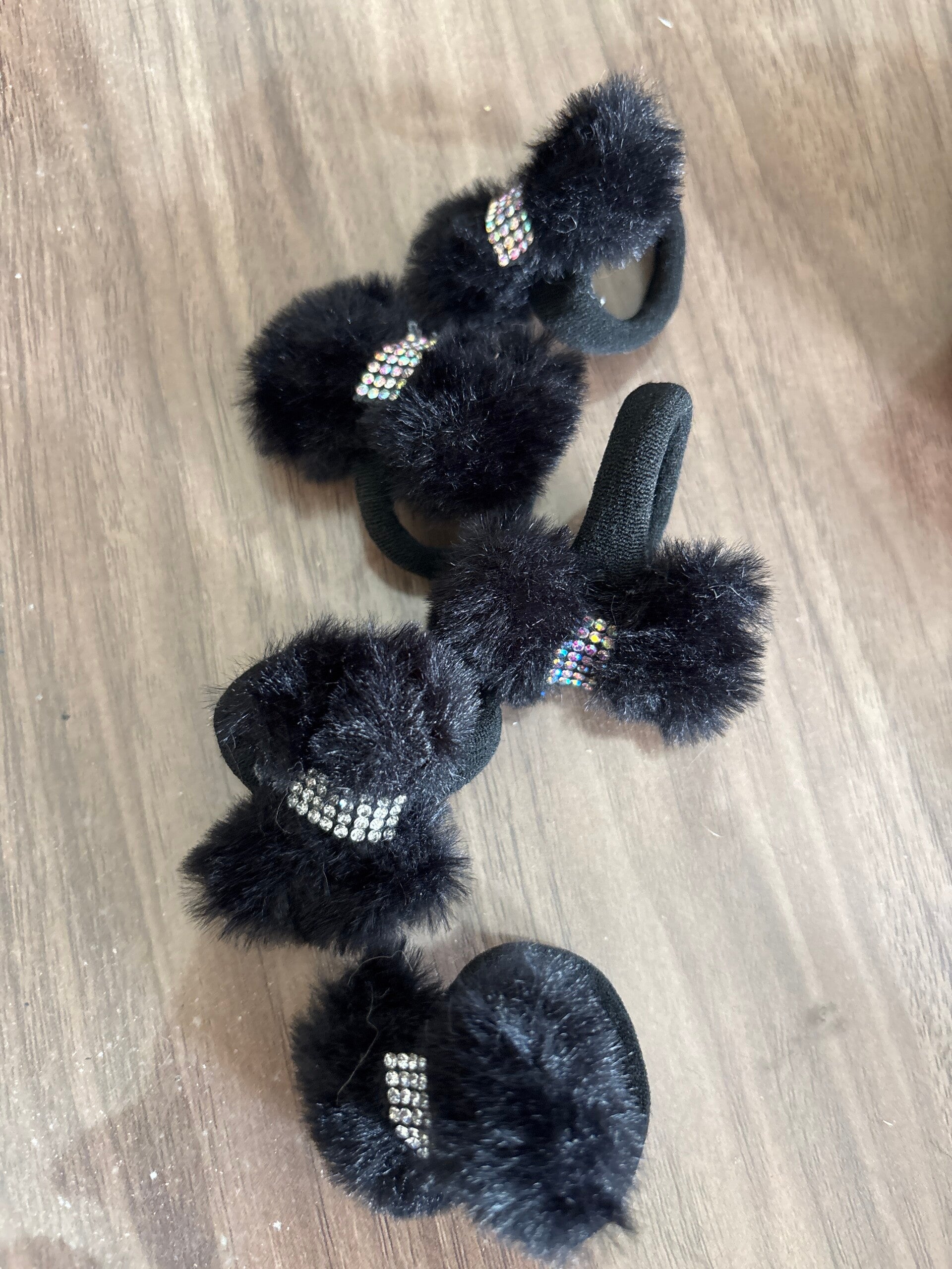 Nämä ihanan pehmeät mustalla tekoturkiskankaasta valmistetut rusetit ihastuttavat. Niiden tekoturkiskangas on ökö-tex sertifioitu. Keskelle on liimattu hopeinen, kimaltava strassinauha. Pompulana on Suomalaisesta yrityksestä hankitut pehmeät pompulat, joihin rusetti on kiinnitetty käsin ompelemalla.
