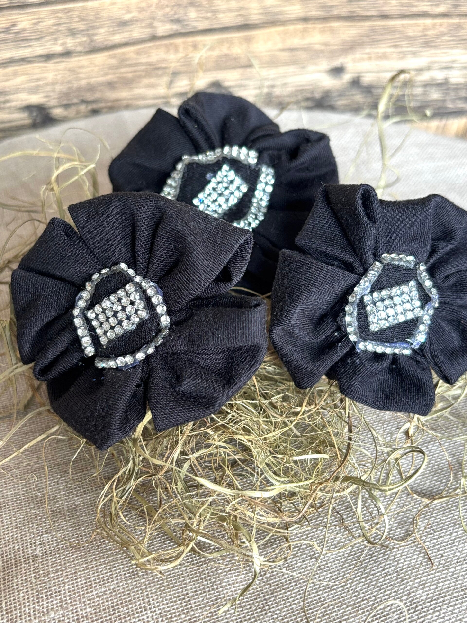 Nämä kauniit mustasta kierrätystrikoosta valmistetut kukka pompulat, ihastuttavat kauneudellaan. Keskelle on liimattu hopeasta, kimaltelevasta strassinauhasta kaunis kukkasen keskus.