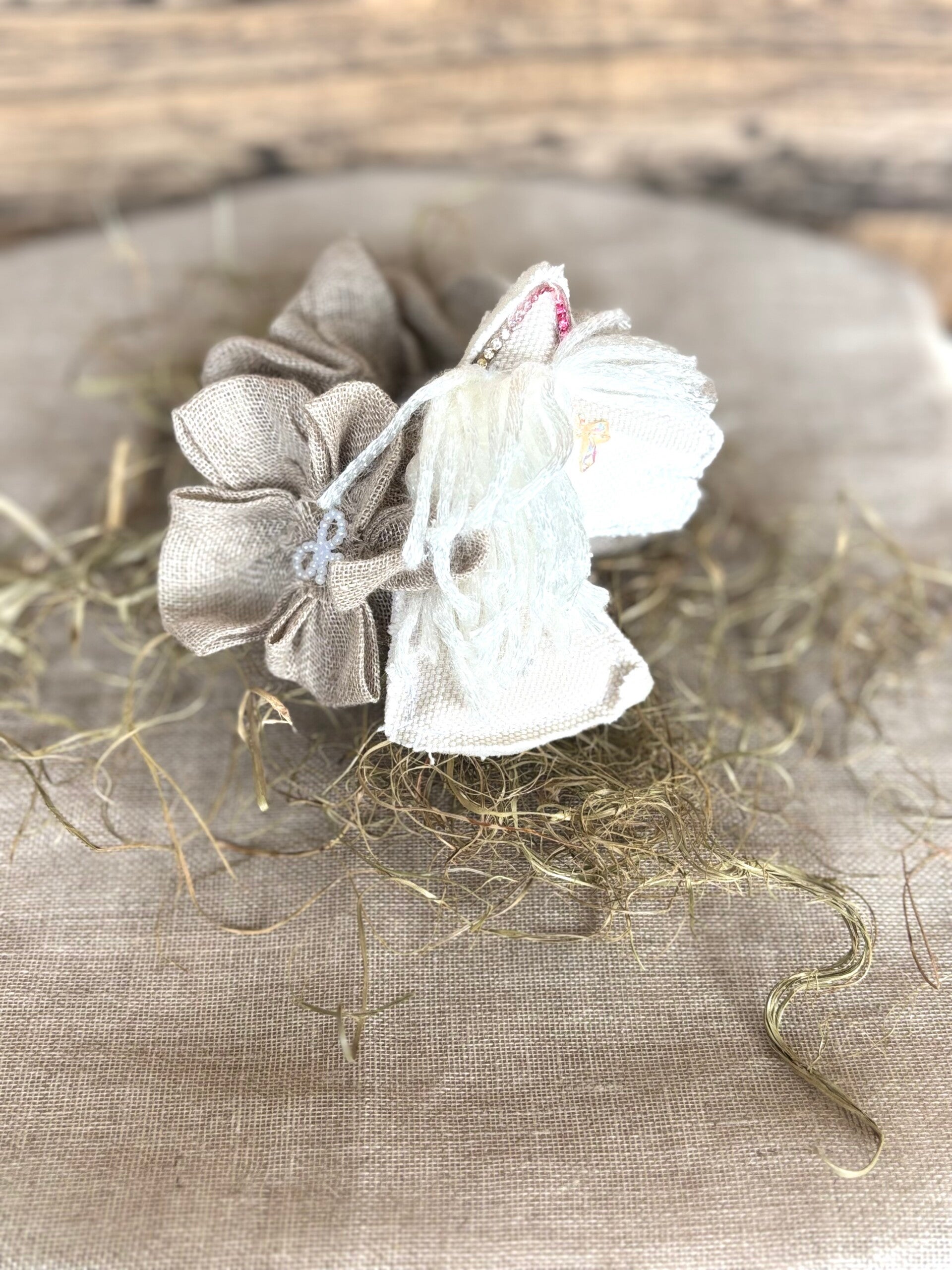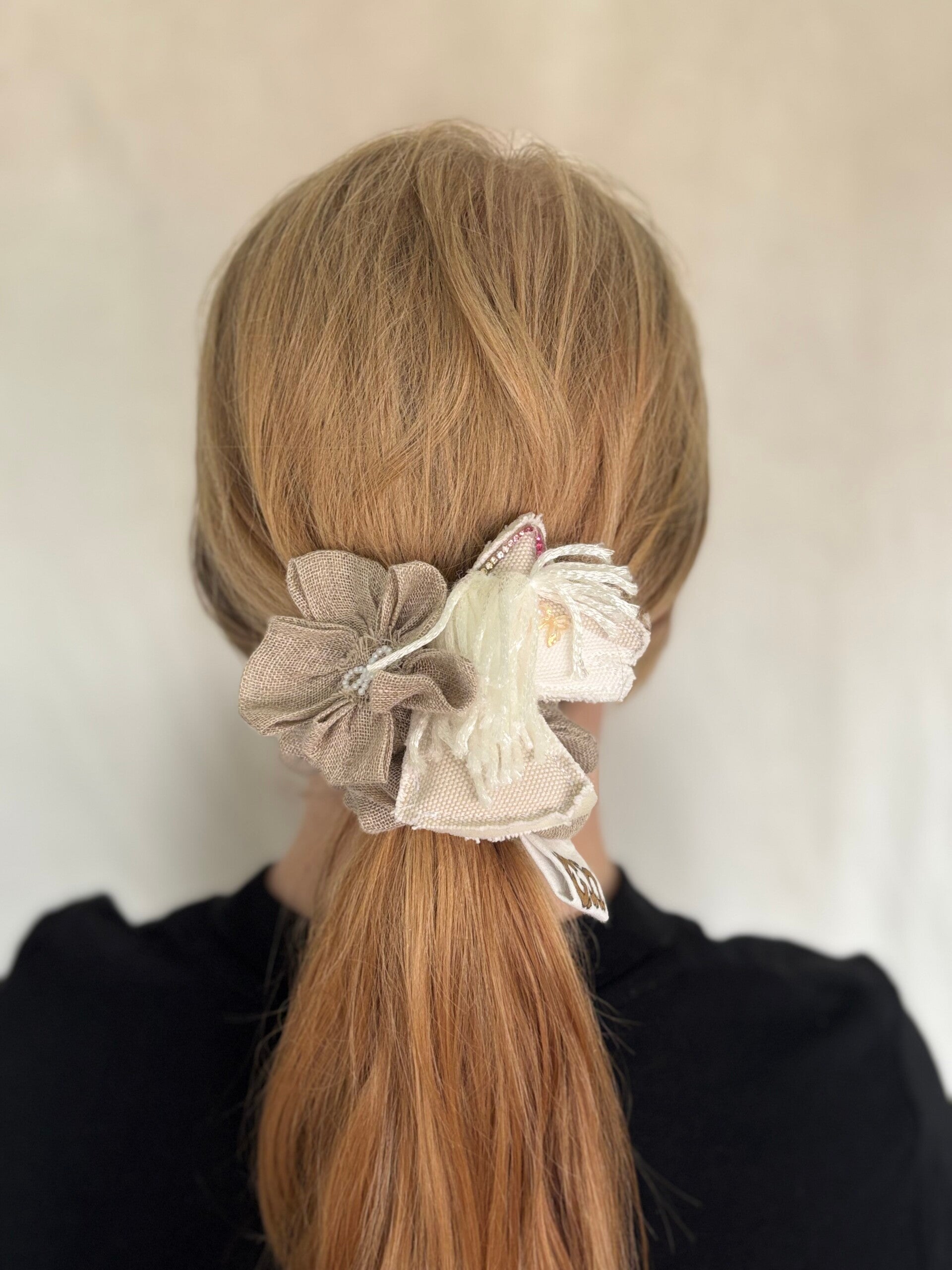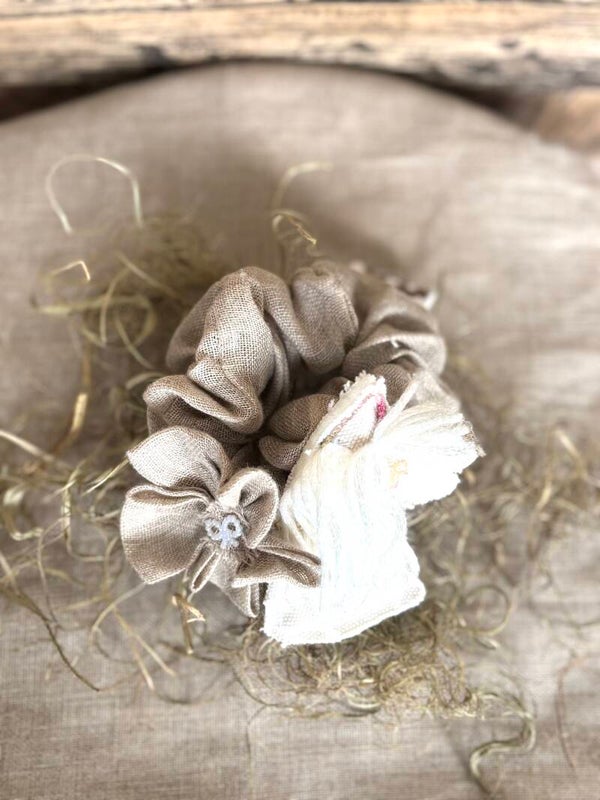 Tämä scrunchie on tehty kauniista, ohuesta pellavakankaasta.(Kierrätyskangas) Scrunchie koristeena on squshy Keppiheppa, jolla on Metallico langasta valmistettu, valkoinen harja.